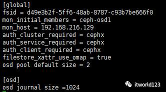 该命令用于开始部署一个新的Ceph集群,并且生成一个该集群的配置文件和钥匙环。该命令会监测指定的Monitor节点是否可以通过ssh无密码访问,确定所指定Monitor节点的IP地址,生成一个包含一个或者多个Monitor节点的Ceph集群。本质上,该命令会生成一个配置文件(ceph.conf),一个Monitor秘钥和一个日志文件。配置文件中包含集群的fsid,Monitor节点的主机名和IP地址以及其它一些必要的信息,具体示例如下图。