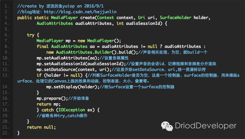 以上代码可以总结为:当MediaPlayer通过Create方式创建播放器时,内部new出MediaPlayer对象 ,并setDataSource,并做好prepare的动作。这时外面只须调用下start方法,音视频资源将能播放起来。