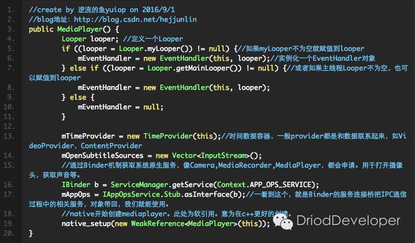 通常我们用通过构造MediaPlayer,然后自己setDataSource,prepare等操作。无论哪种都要先经过new MediaPlayer(),我们看下构造中做了什么操作: