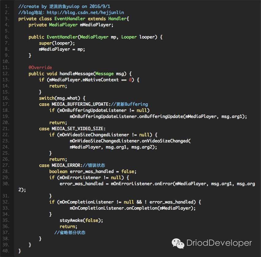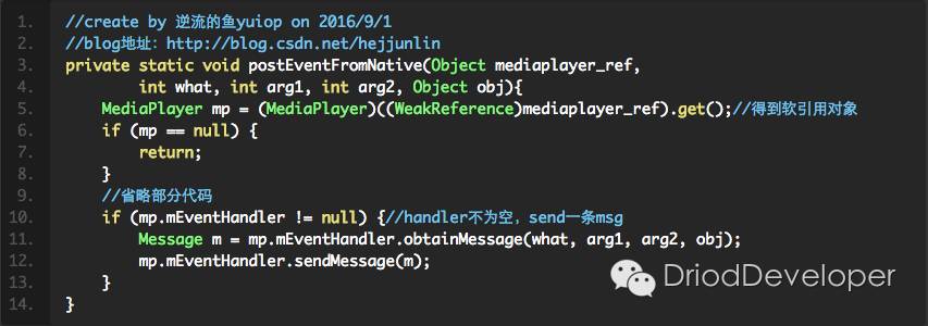 被native层调用,就是反向调用,仅被使用EventHandler post事件回到主线程中,很多用post开头,基本都是post到主线程,用软引用指向原生的MediaPlayer,以便native代码是安全的,当MediaPlayer可在native释放,调到java中的实现部分如下: