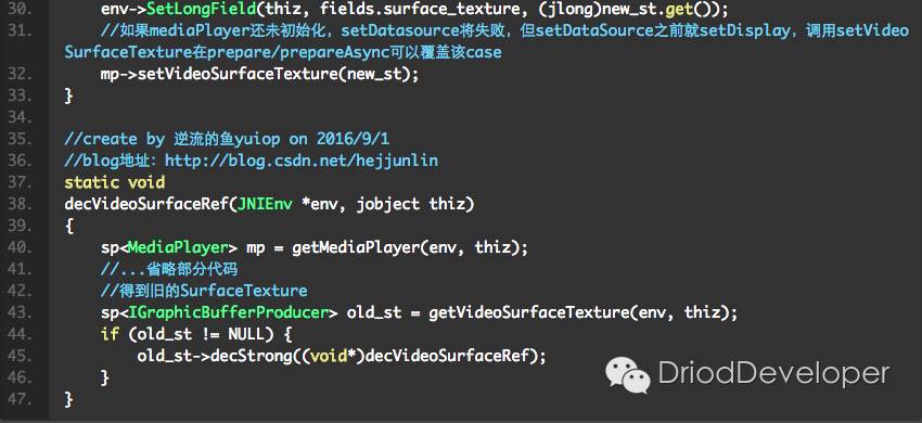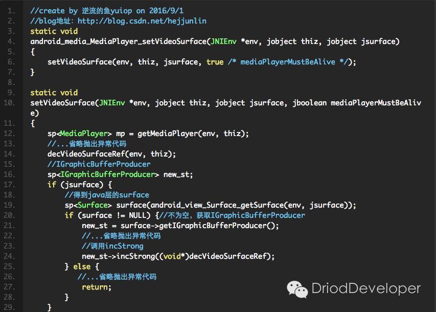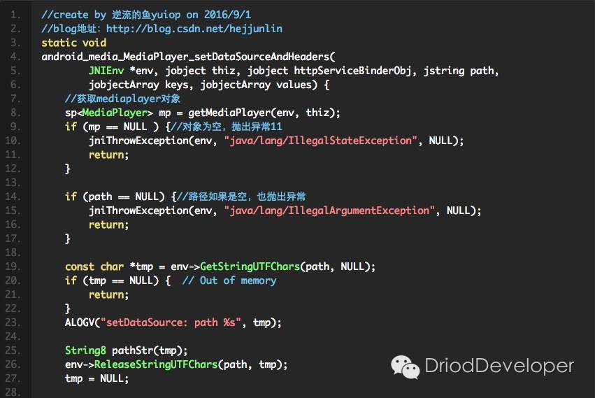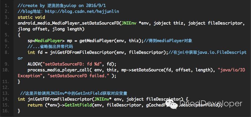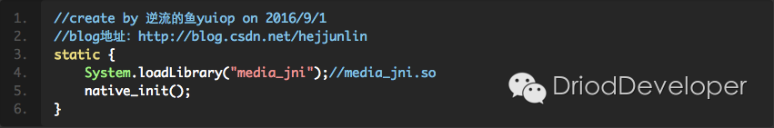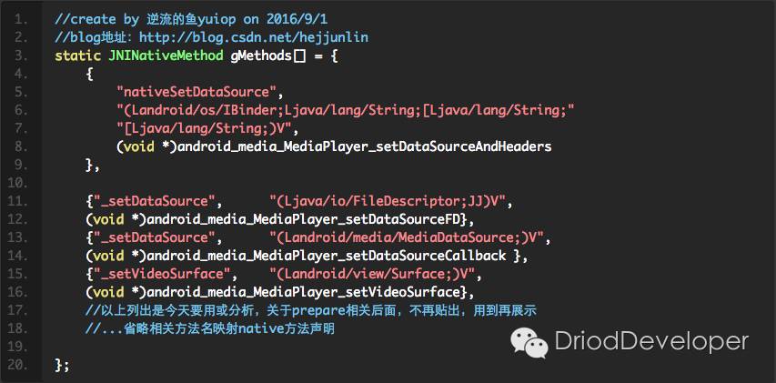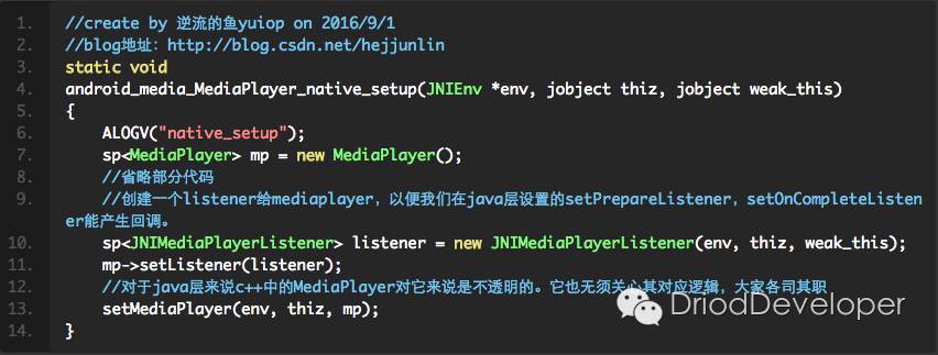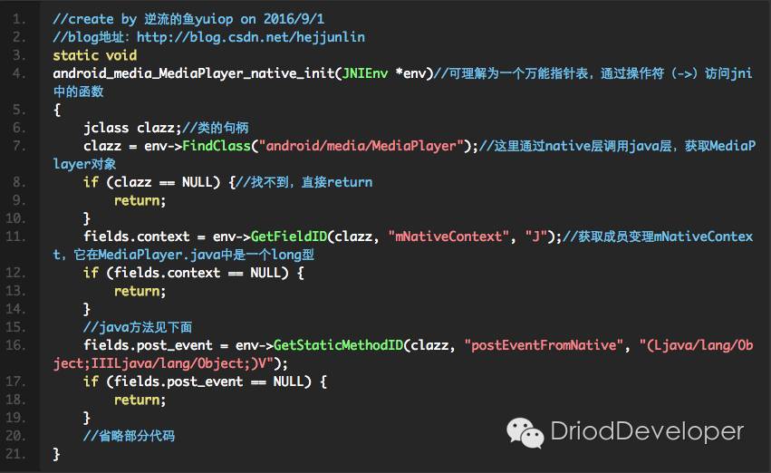开始进入android_media_MediaPlayer.cpp分析,第一个方法,就是在java静态代码块调入的native_init: