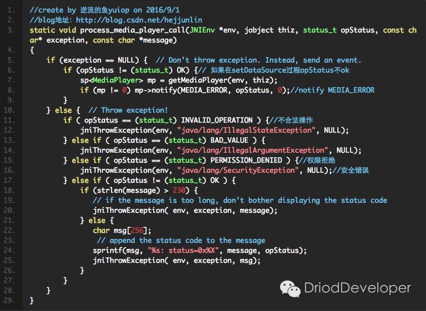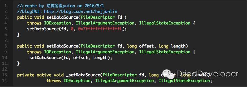 以上代码总结为:当 mp->setDataSource(fd, offset, length)方法后得到status后,对各种状态进行notify。有异常的直接抛出,这样也就不会影响mediaplayer后面的执行过程。