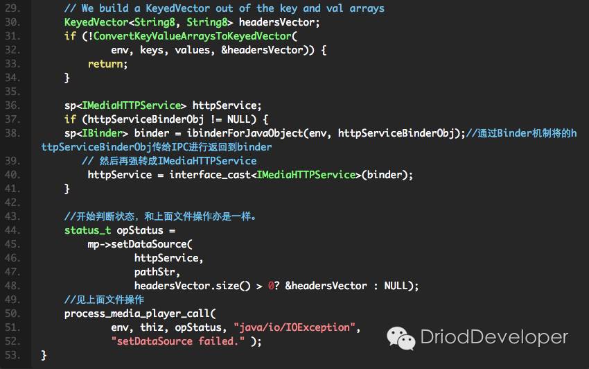 到此,setDataSource的过程就完成了。这里要注意两个点,一个是从Java->jni->c++正向调用过程(前面从java到native都是正向过程),一种是c++ -> jni -> java层过程(如 mp->setDataSource( httpService, pathStr, headersVector.size() > 0? &headersVector : NULL),那有人肯定会问了?这样来回调的好处是什么?