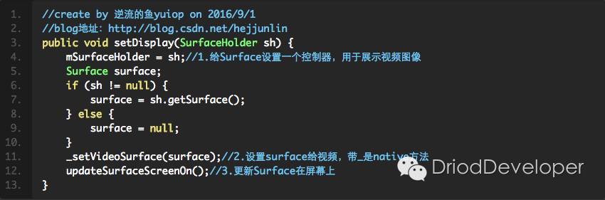 通过当修改Surface中的数据完成后,释放同步锁,并提交改变Surface的状态及图像,将新的图像数据进行展示。而最后综合:SurfaceView中调用getHolder方法,可以获得当前SurfaceView中的Surface对应的SurfaceHolder,SurfaceHolder开始对Surface进行管理操作。这里其实按MVC模式理解的话,可以更好理解。M:Surface(图像数据),V:SurfaceView(图像展示),C:SurfaceHolder(图像数据管理)。MediaPlayer.java中setDisPlay的操作就是对将要显示的视频设预设置。