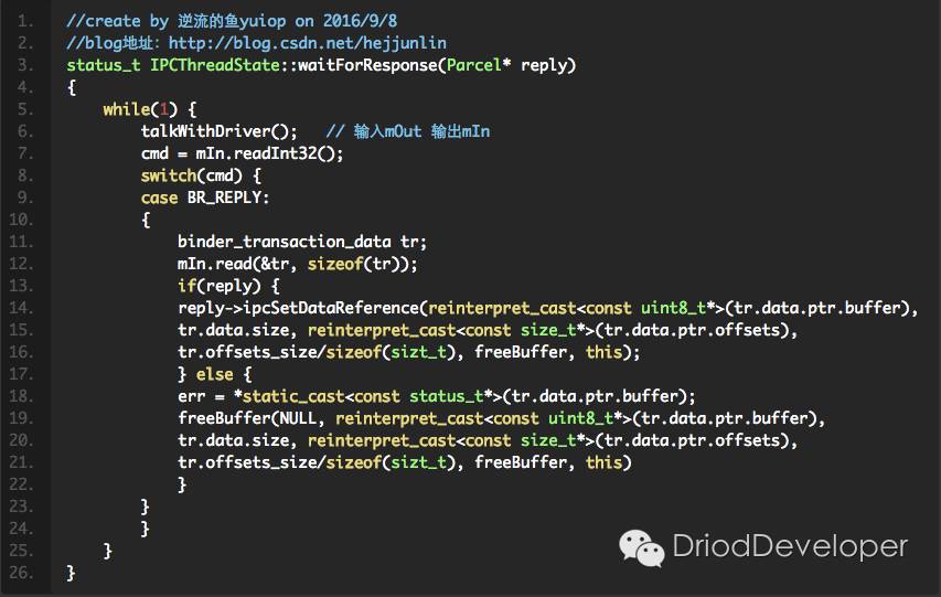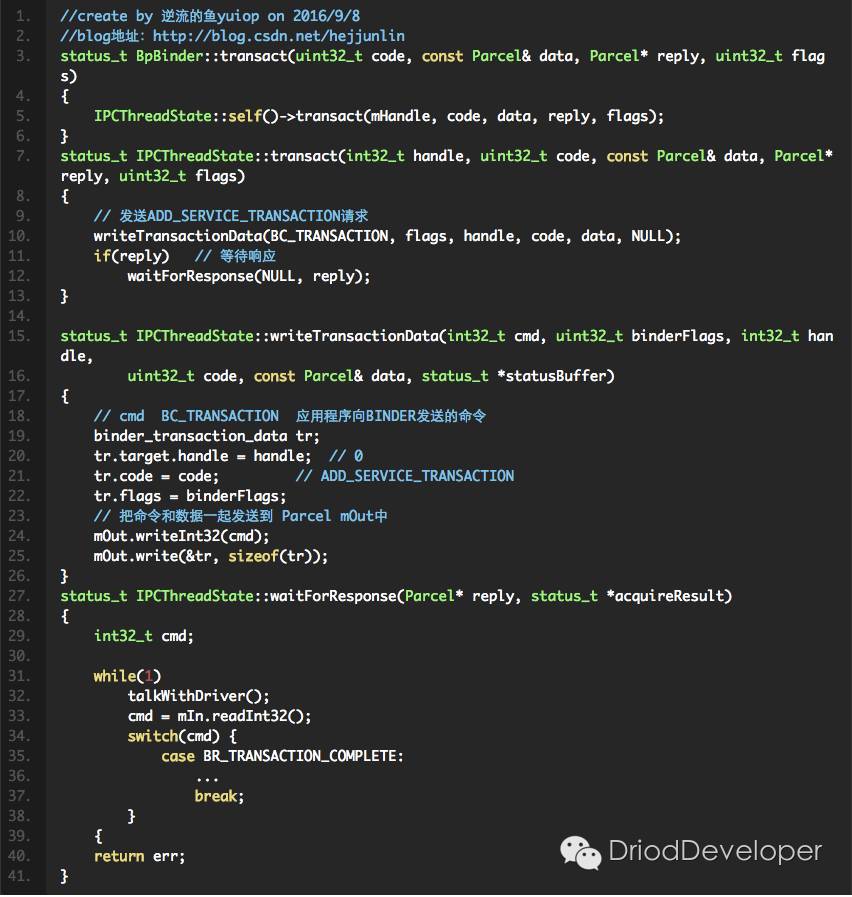 在BpXXX中,把对应的binder_transaction_data打包之后通过BpRefBase中的mRemote(BpBinder)发送出去,并等待结果