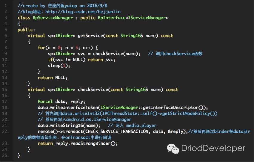 的就是前面new BpBinder(0)对应句柄为ServiceManager。继续去BpBinder中寻找实现代码: