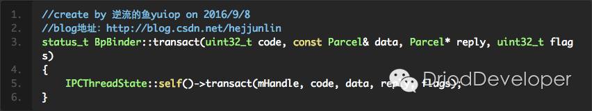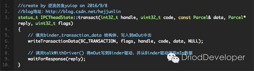 最后调用的IPCThreadState的transact()函数,IPCThreadState是专门提供通过Binder进程间通信的接口的。
