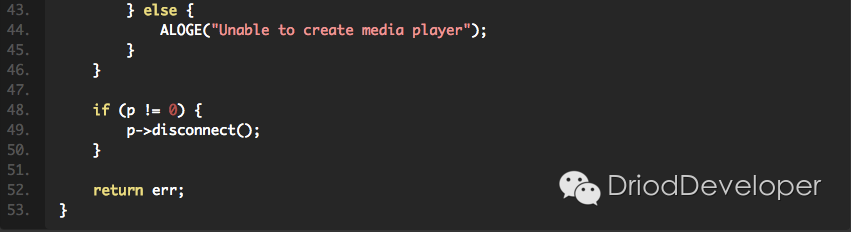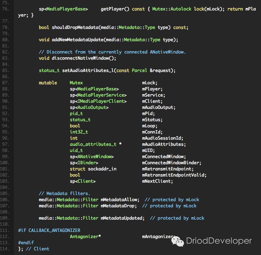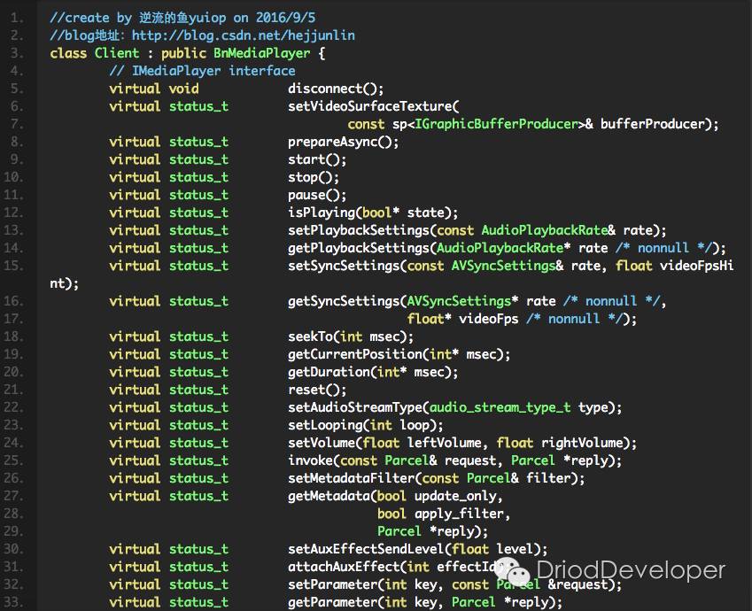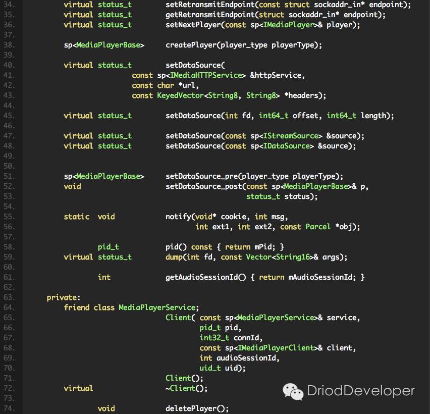 以上代码没有省略,是因为确实对我们理解从Java层过来的MediaPlayer相关方法,在这都有对应。如果还记得前面《Android Multimedia框架总结(四)MediaPlayer中从Java层到C++层类关系及prepare及之后其他过程》文章中那个图的话,可以从整体上理解这个Client属于什么角色及位置。继承BnMediaPlayer,并包含了IMediaPlayer相关接口。