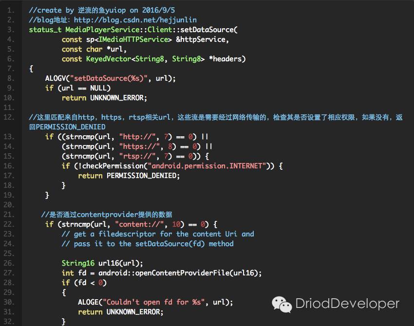 总结下上面代码:Client类的继承关系为:Client->BnMediaPlayer->IMediaPlayer分析上面代码,可以看出create方法,是构造了一个Client对象,并且将此client对象添加到mediapalyerservice类的全局列表中:mClients,是一个SortedVector,紧接着执行player->setDataSource(url, headers),即Clients::setDataSource,因此在setDataSource中的
