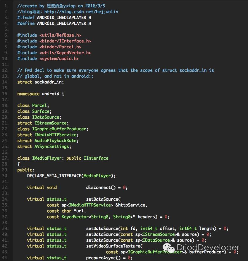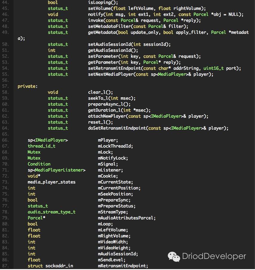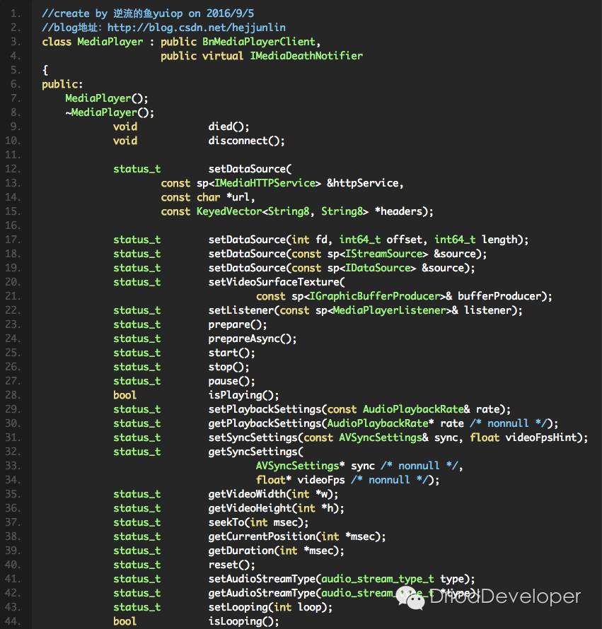 接下来看MediaPlayer中,以下代码中在frameworks/av/include/media/mediaplayer.h中:
