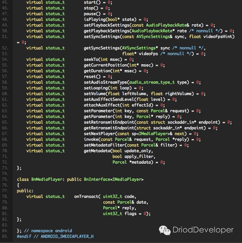 IMediaPlayer.h中定义的基本上都是虚函数,而我们知道虚函数在C++中就是实现多态性(Polymorphism),多态性是将接口与实现进行分离;用形象的语言来解释就是实现以共同的方法,但因个体差异而采用不同的策略。所以它的功能是一个实现MediaPlayer功能的接口,看到那个onTransact方法,自然联想Binder通信,把底层的Parcel指针类型数据向上层向另一个进程中传递。