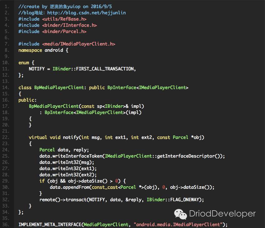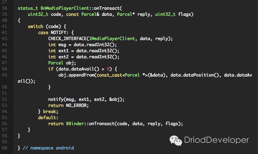 上面代码总结为:在内部定义一个BpMediaPlayerClient(也就是Client的父类),然后它也有一个onTransact,一般onXXX都是属于背动回调过来的,不是由自己控制,如Activity中onCreate,onPause,onStart,这些都是在其他地方处理,通知到Actvitity中的。这里也是一样,onTransact作为Binder通信中的回调方法,前面《Android Multimedia框架总结(四)MediaPlayer中从Java层到C++层类关系及prepare及之后其他过程》中介绍到player实际上是C/S模式整体,IMediaPlayerClient.h的功能是描述一个MediaPlayer客户端的接口。