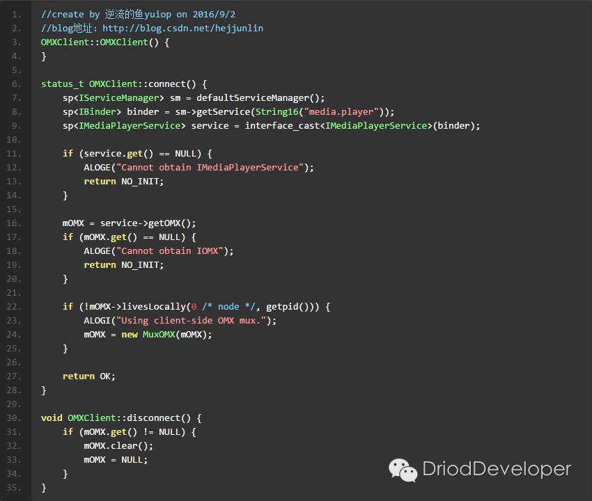 OMXClient::connect函数是通过binder机制 获得到MediaPlayerService,然后通过MediaPlayerService来创建OMX的实例。这样OMXClient就获得到了OMX的入口,接下来就可以通过binder机制来获得OMX提供的服务。
