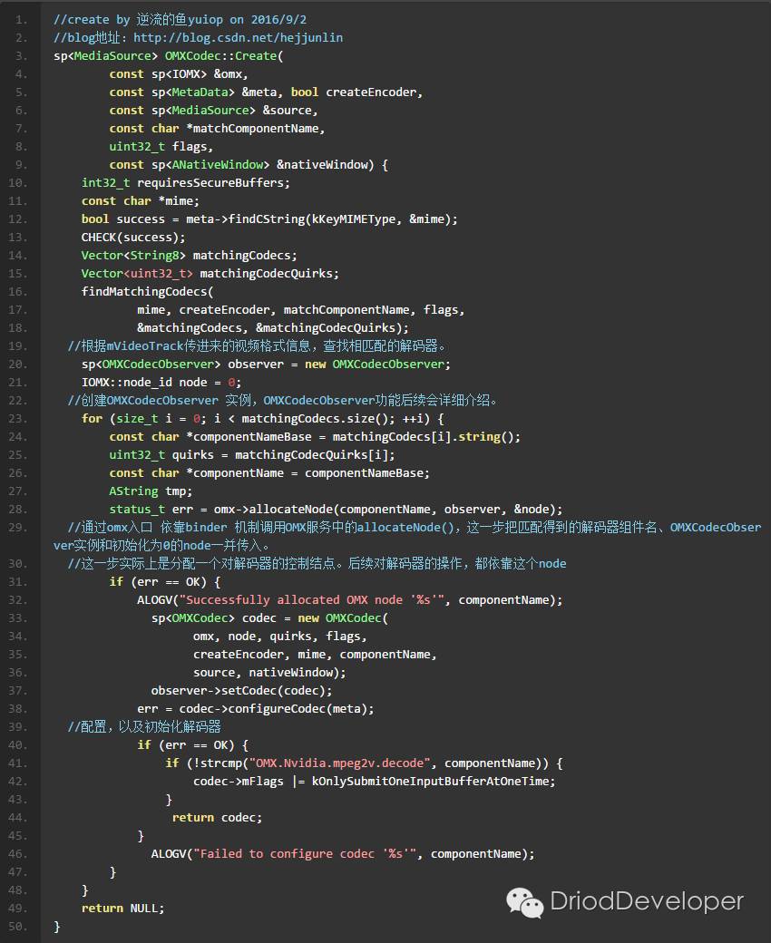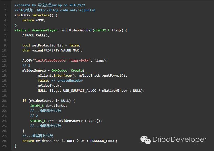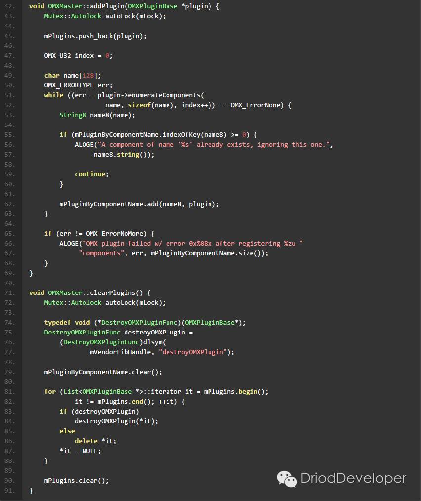 背景: Android系统中用OpenMAX来做编解码,Android向上抽象了一层OMXCodec,提供给上层播放器AwesomePlayer用。播放器中音视频解码器mVideosource、mAudiosource都是OMXCodec的实例。