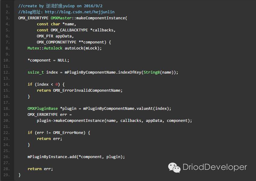 4、在 omx->allocateNode中 通过mMaster->makeComponentInstance 来创建真正对应的解码器组件。这个解码器组件是完成之后实质的解码工作的。