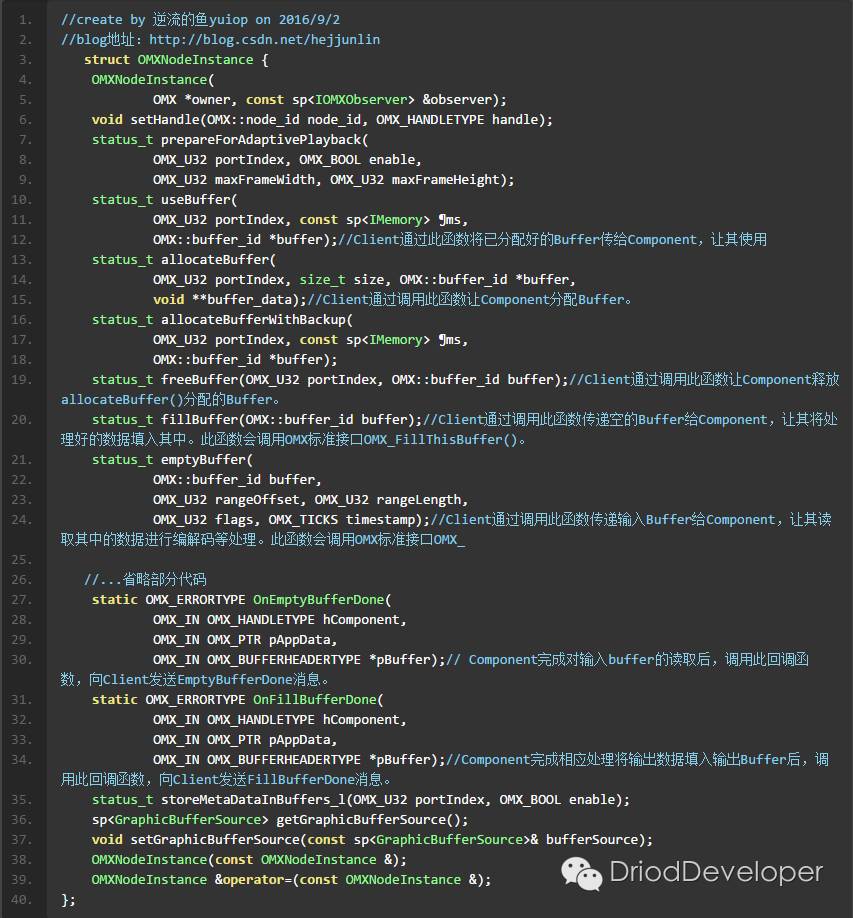 如fillBuffer,emptybuffer,sendCommand等,都是通过OMX_Core.h中的宏定义间接调用OMX_Component.h中的OMX_COMPONENTTYPE这个struct中的相应函数指针来完成。OMX_Core.h和 OMX_Component.h都是OpenMAX标准头文件。