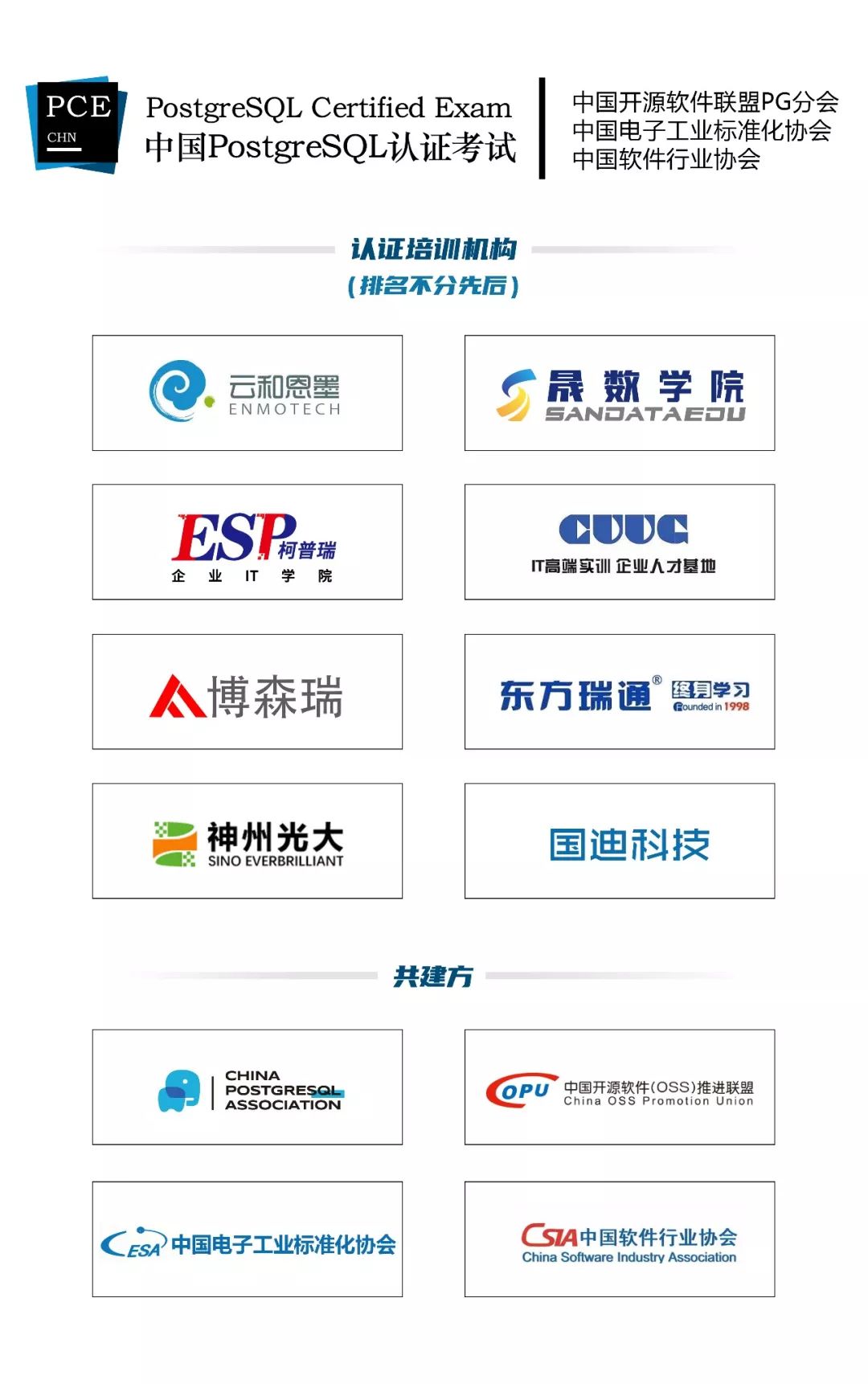 2019,PostgreSQL中国培训认证体系从无到有。“中国PG分会—PG培训认证”获得工信部下属中国软件行业协会、中国电子工业标准化技术协会权威认证,列入“中国电子信息专业人才培养工程”之中。恩墨学院、晟数学院、CUUG优技、博森瑞、柯普瑞等多家培训机构成为授权合作伙伴,800余位技术人员参与认证。“PG中文社区—PG培训认证”与海量学院、乘数学院等机构合作,德哥、汪洋等多位社区专家参与指导,在北京、广州、杭州组织了多次培训考试。星星之火,可以燎原!这几百位初中级PG认证技术人才将会是PG未来发展的火种。