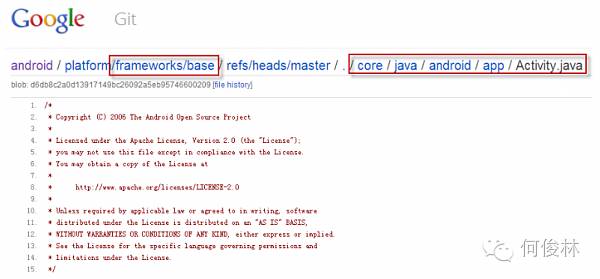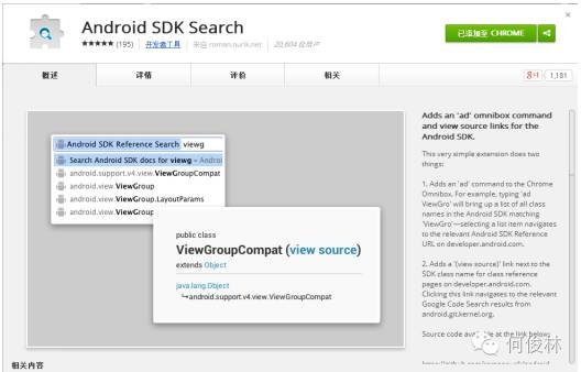 在 Android 开发或者源码分析时,一般会去查看 Google 官方提供的 Android API,如果希望深入了解 API 实现的细节,当然最好的方法就是去看源代码了。对于在线 API 文档,如果在查看时,还能够查看到源代码那当然是最好不过的。在 Chrome 浏览器下,可以安装 Android SDK Search 扩展程序来达到这个目的,该扩展程序在 Chrome网上应用店截图如下所示。安装完该扩展程序后,再次搜索 Android API 后,会在相应的搜索结果后增加一个 view source链接。例如搜索 Activity 类,结果如图 4 所示。点击 view source链接,就可以打开 Activity类的源代码,如图所示,从网页中可以看出其实是链接到了 Google 的 Android 源码的 Git