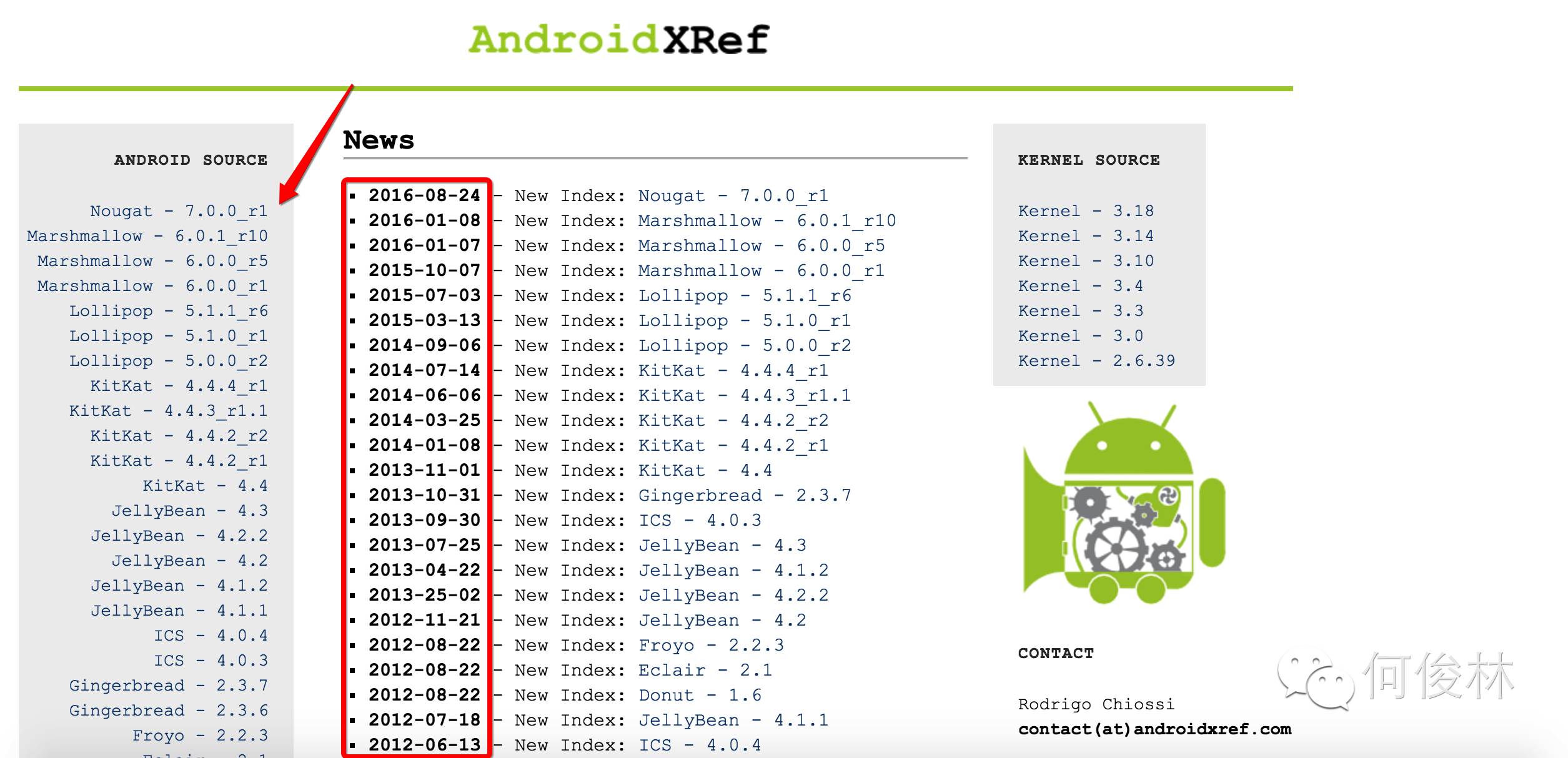 AndroidXRef(http://androidxref.com/)项目提供 Android 源码的交叉索引,可以快速的搜索符合特定条件的 Android 源代码,后台是基于 OpenGrok 引擎,OpenGrok是一个快速,便于使用的源码搜索引擎与对照引擎,它能够帮助我们快速的搜索、定位、对照代码树。AndroidXRef 提供了完整的 Android kernel源码的索引。在 AndroidXRef 主页的右侧显示了可用的源码版本,如图所示,