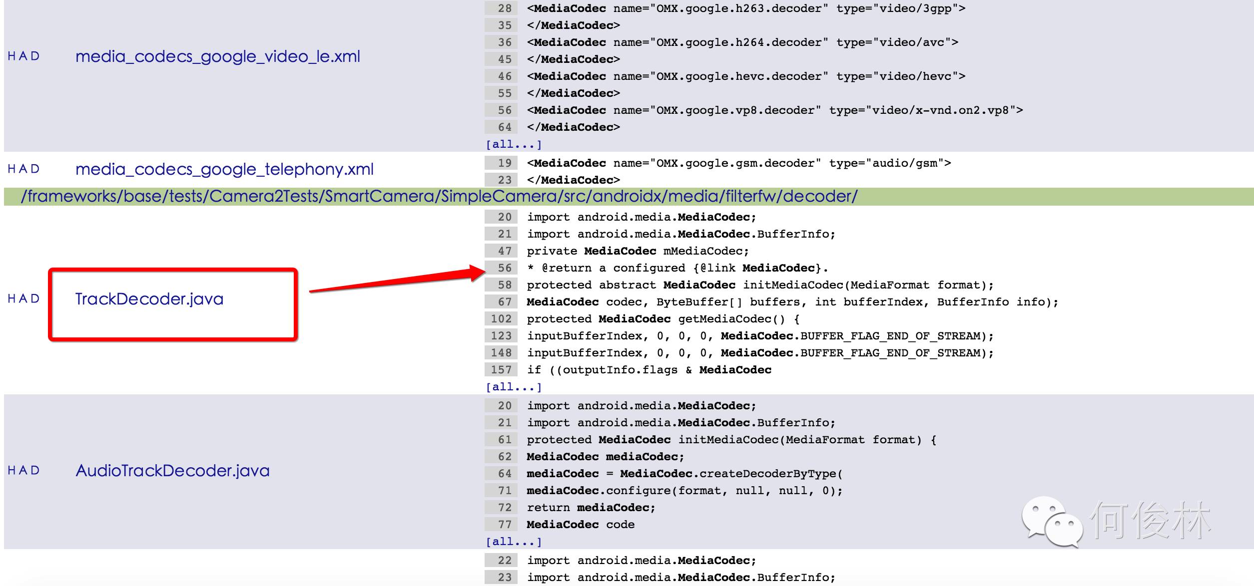 点击左侧文件名如 TrackDecoder.Java链接会打开包含mediacodc字符串文件;