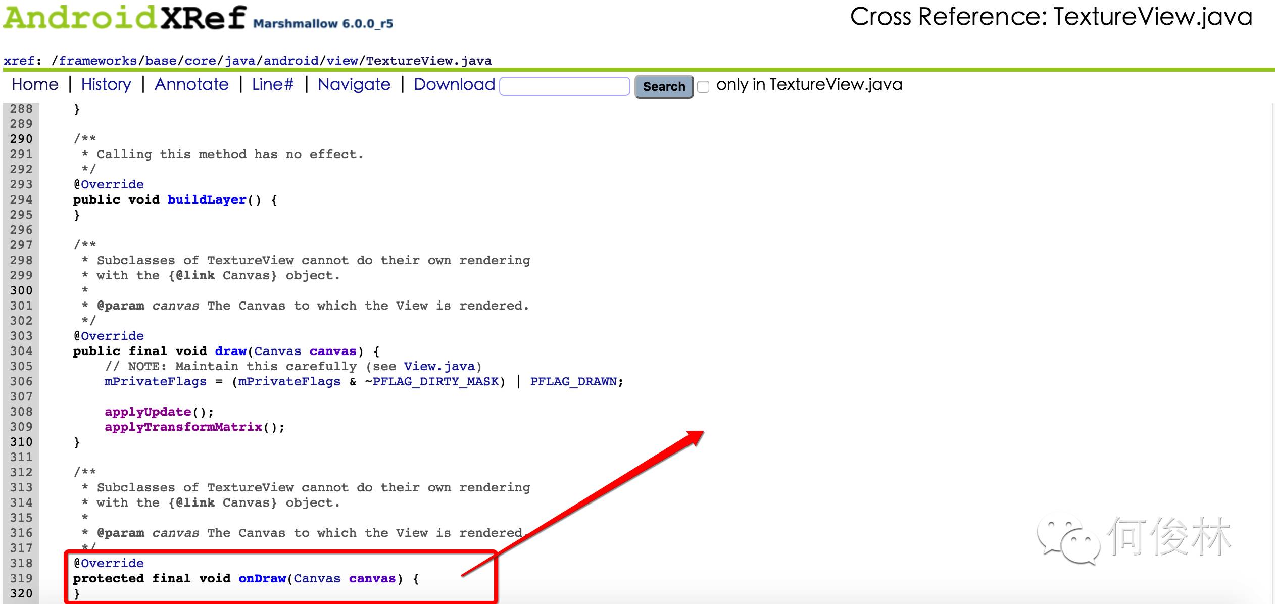 从搜索结果可以看到,所有onDraw方法的类都会列出来,到第6页,找到我们熟悉的TextureView,点击进去