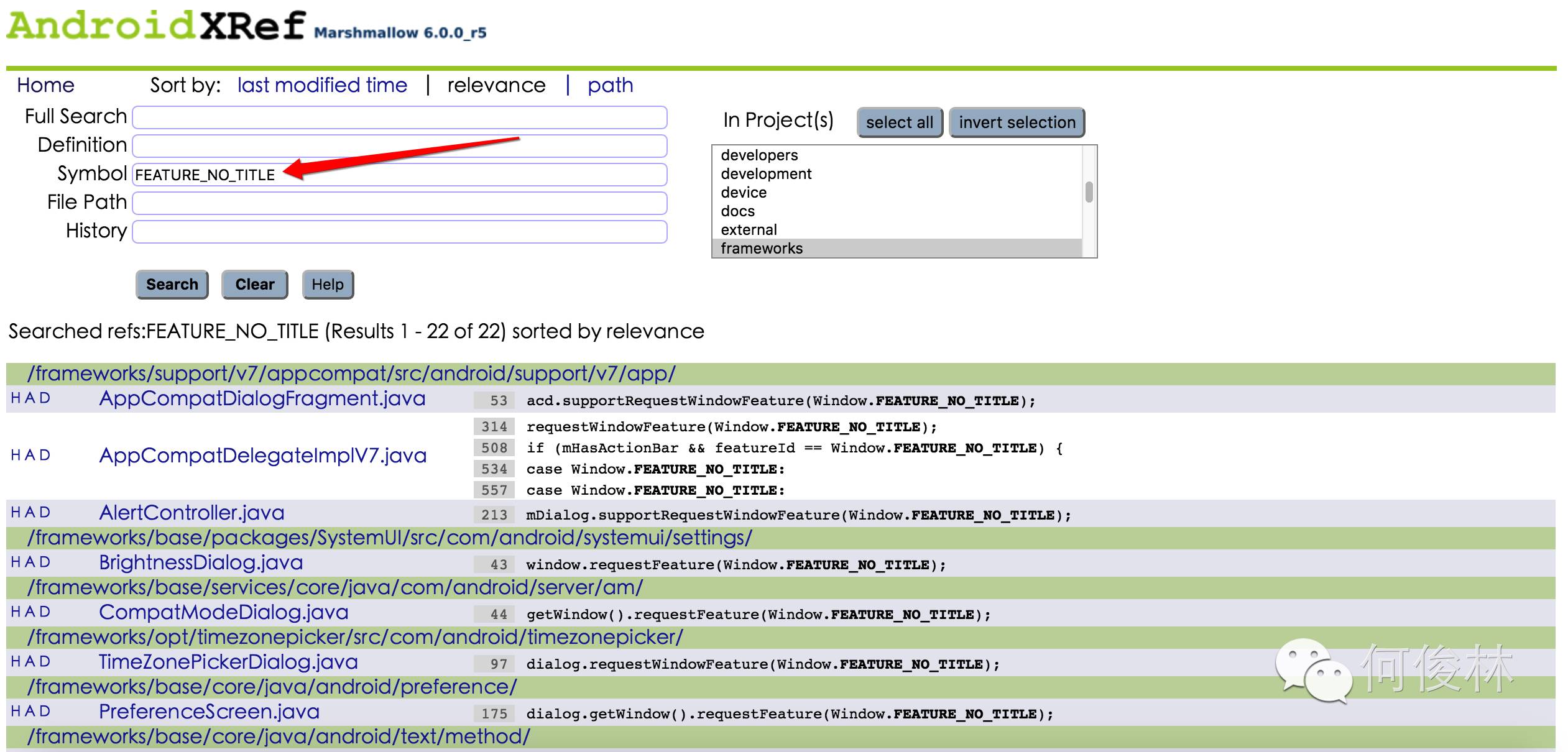 由于AndroidXRef 使用的是 OpenGrok 引擎,因此还支持一些其他的搜索方式:在【http://androidxref.com/6.0.0_r5/help.jsp】,写的相当详细,感兴趣的同学可以看看。