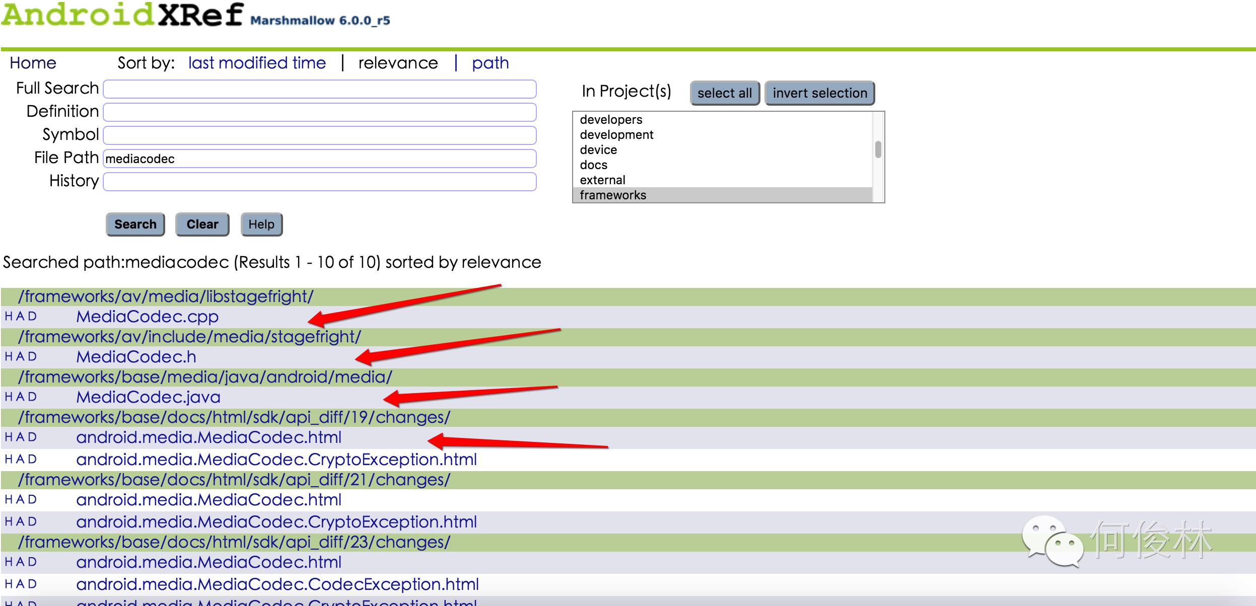 File Path:搜索源码文件名中包含给定字符串的文件,例如想要搜索文件名包含mediacodec的源码文件,则可以在 File Path 中填入 mediacodec 进行搜索,结果如下所示
