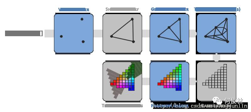 下图就是一个顶点数据经过几个步骤后转化成显示在屏幕上像素的过程(一般也叫做GLSL的流水线工作流程),蓝色图形部分是我们可以通过写shader文件参与的,目前参与比较多的主要是顶点和片段shader。