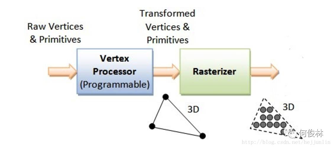 2、 顶点着色程序对顶点数据进行转换,把Vertex Data中的3D坐标转换成对应的不同于Vertex Data中的3D坐标,在这里,顶点着色程序允许用户进行一些基本的处理和顶点属性设置。