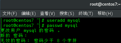 我们进入到CentOS后,打开终端命令窗口,新建一个msql用户,并输入密码