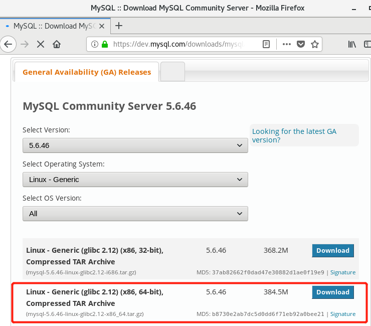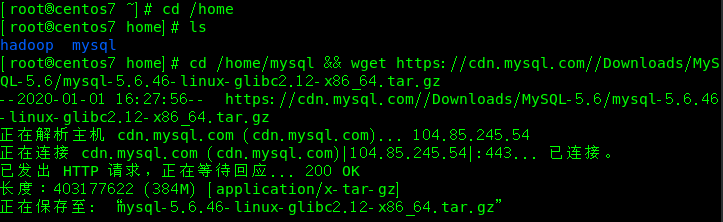 cd /home/mysql && wget https://cdn.mysql.com//Downloads/MySQL-5.6/mysql-5.6.46-linux-glibc2.12-x86_64.tar.gz
