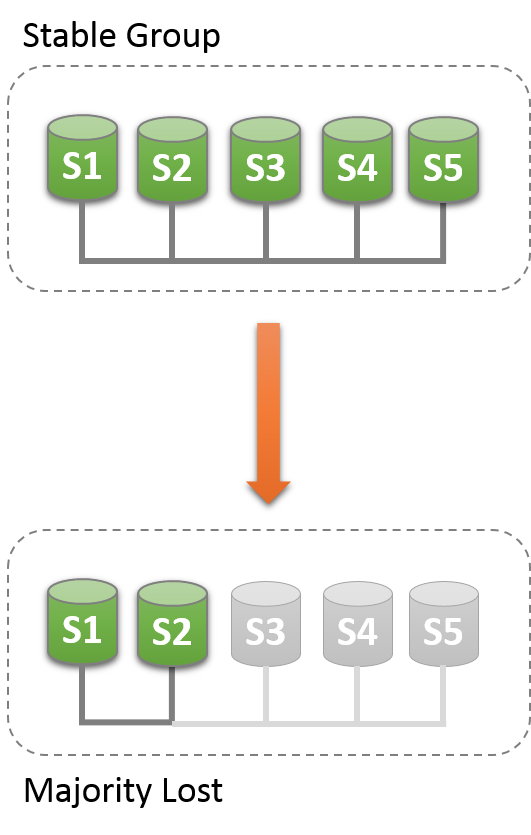 当组中的多个成员出现意外失联(Unreachable)时,组可能会失去足够的仲裁人数(失联的成员数量超过组总成员的半数)。例如,在一个由5个成员组成的组中,如果其中3个成员同时处于静默状态(无任何响应),则此时就无法实现仲裁。因为剩下的两个成员无法判断其他3个成员是否崩溃了,或者是否发生了网络分区导致这2个成员被单独隔离了,因此不能自动执行重新配置组。