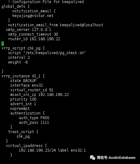 这里使用的是keepalived的方式进行IP 的切换,之前几期是有包含repmgrd 自动切换从到主的方式,所以剩下的就是IP的切换问题。原因俩字,方便。