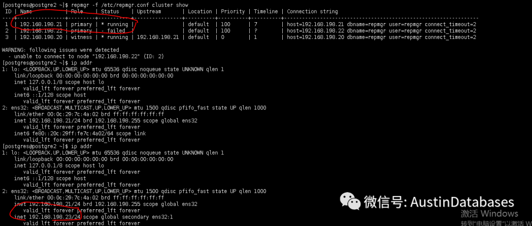 目前主库是在22上,关掉22的POSTGRESQL 的服务,等待REPMGRD 切换主从,于此同时通过KEEPALIVED来检测 PG的服务,然后进行切换IP 的工作。