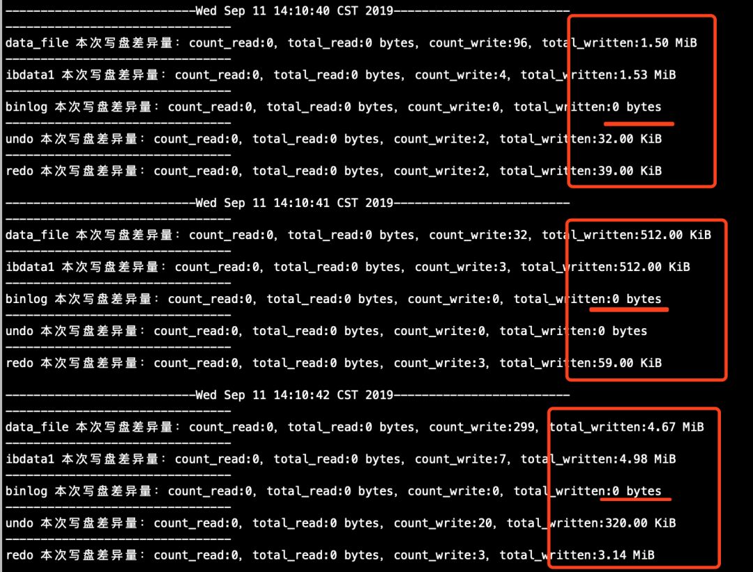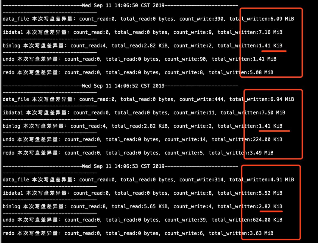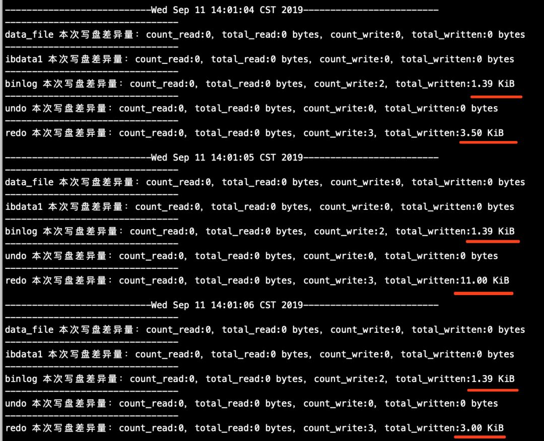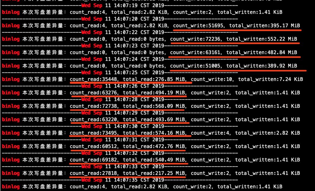 从上述图13和图14中可以看到,吞吐统计数据都毫无悬念地大幅增加了,不过。。主库中出现了一个临时文件/data/mysqldata1/tmpdir/MLrxkcac,读取和写入的总流量都为1.78G,从库中也出现了一个临时文件/data/mysqldata1/tmpdir/MLirV7PX,读取和写入总流量也都为1.78G,额,还真是巧了,这个临时文件是做啥的呢?再仔细一看图13中主库的/data/mysqldata1/binlog/mysql-bin.000024文件的写入总流量也为1.78G,主从库中出现的临时文件会不会跟写binlog有啥关系呢?咋们来推导一下,大事务未提交时,binlog是不能落盘的,那整个事务的binlog日志量往哪里放呢?内存?那万一内存不够用怎么办?那写磁盘吧?往哪儿写呢?临时文件?会不会这里看到的这个临时文件就是用来暂存未提交大事务的binlog的呢?