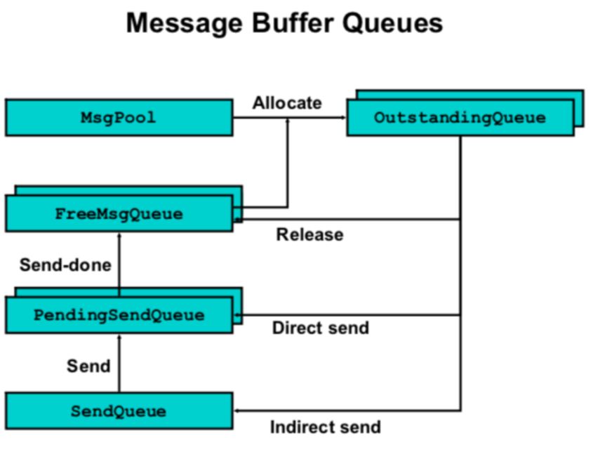 每个进程都有OutstandingQueue,FreeMsgQueue和PendingSendQueue。每个实例都有SendQueue和MsgPool。此外Oracle设计了一个阈值可以触发进程开始将可用的可用消息缓冲区缓存释放回共享消息池。