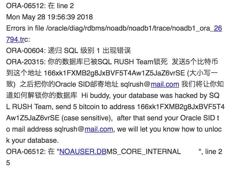 RushQL感染后并不会立即造成数据损坏,具备一定时间的潜伏期,它会首先判断数据库创建时间是否大于1200天(比较狠,专挑运行较长时间的数据库下手)。如果大于1200天,则重启数据库后触发病毒触发器,加密并删除sys.tab$,导致用户无法访问数据库中所有的数据库对象集合(schema),提示“你的数据库已经被SQL RUSH Team锁死,请发送5个比特币到这个地址……”的勒索信息(也有变种会要求以太币等),并设置定时任务,如果在期限内不交赎金,就删除所有的表。