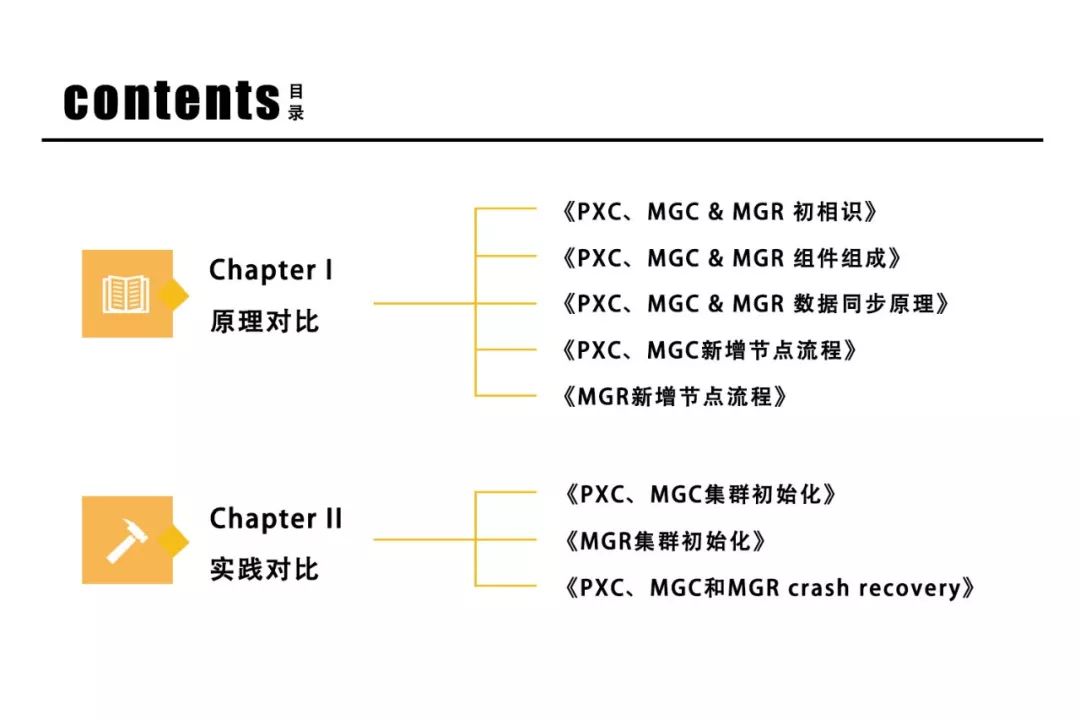 该课程主要内容是关于MySQL目前主流的数据库集群解决方案PXC、MGC、MGR相关原理及实践对比。课程分为两大章节,共8个课时。课程由浅入深,依次为大家介绍不同集群架构实现组件及组件的作用、数据同步原理的异同点、新增节点的流程、初始化步骤以及crash之后recover步骤。