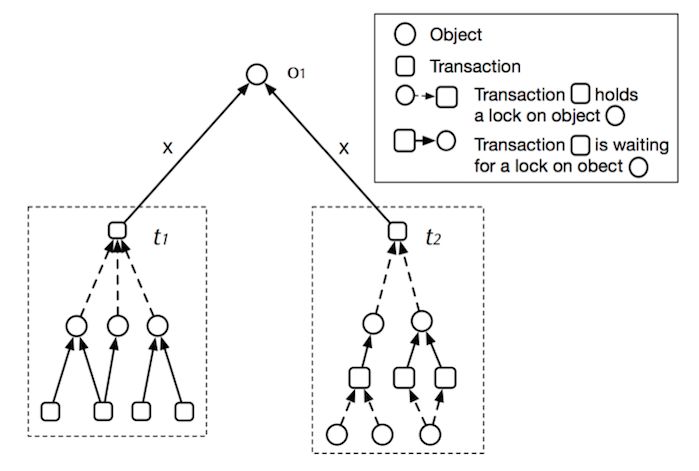 当然,我们现在是在解决锁的问题而不是交通司机的问题。让我们通过一个简单的例子来阐述一下CATS机制在数据库中是如何工作的。我们知道在不同的事务隔离级别下,事务在读取或者更新数据的时候,需要先获取对应数据的锁。当一个事务所需要的锁已经被其他事务所持有了,那么这个事务会一直等待直到其他事务释放这个锁。当事务已经持有一部分对象锁的时候,可能会在获取其他对象的锁的时候一直被阻塞住,这个时候就需要死锁检测机制来检测当前数据库中没有锁等待循环,防止死锁。来看下面这张图: