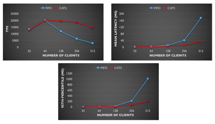 CATS vs. FIFO in TPS, mean latency and 95th percentile (up to 5.05x improvement)