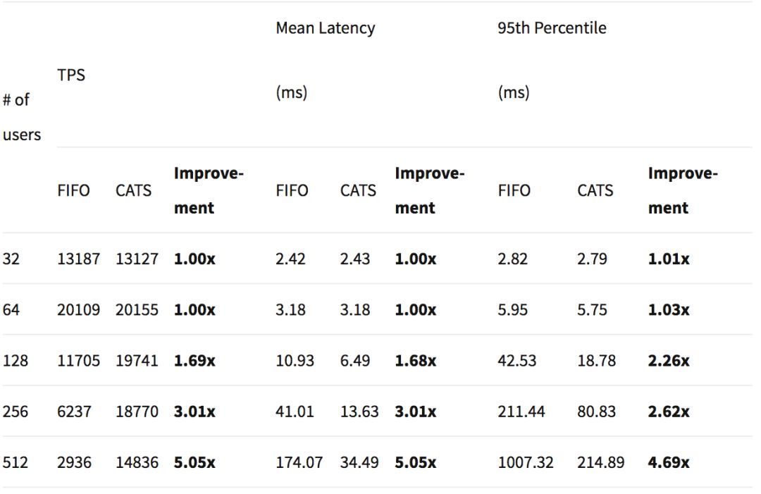 最近一个密歇根大学的研究组织提出,这个问题背后隐藏着巨大的性能提升空间。Mozafari教授和他的学生证明了不同的锁分配策略以及事务调度策略对于数据库性能有着很大的影响。他们提出了一种称之为Contention-Aware Transaction Scheduling(CATS)的算法,使用这种算法进行事务调度相较于之前的FIFO策略,显著地减少了数据库延迟,提高了吞吐量。
