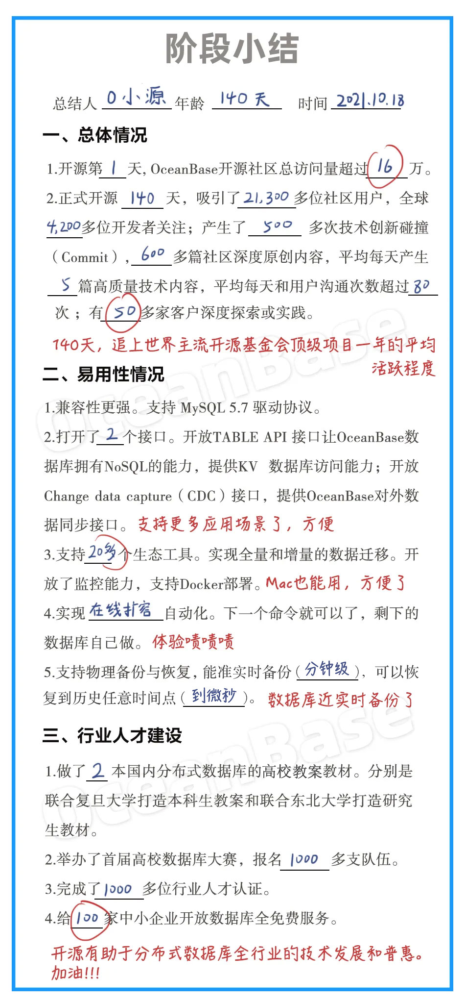 2021年6月1日 OceanBase 正式宣布开源,第1天即有超过16万人次访问社区。开源 140天,OceanBase 社区共吸引全球21,300多位用户,4,200多位开发者 Star 关注,产生了500 Commit 代码提交,600多篇社区深度原创内容, 1000+行业人才通过认证,超过50家企业深度实践。140天的努力,OceanBase 已追上全球顶级开源项目1年的平均活跃度。本次发版特别参考了快手、携程、Bilibili、六棱镜等公司提供的宝贵意见和建议。OceanBase 开源版3.1.1只是一个开始,后续 OceanBase 将根据全球用户反馈加速迭代持续优化,满足用户更多场景的使用,推进国内开源生态的发展。点击 “ 阅读原文 ” 查看开源版 3.1.1 Release Notes,开启原生分布式数据库探索之旅!