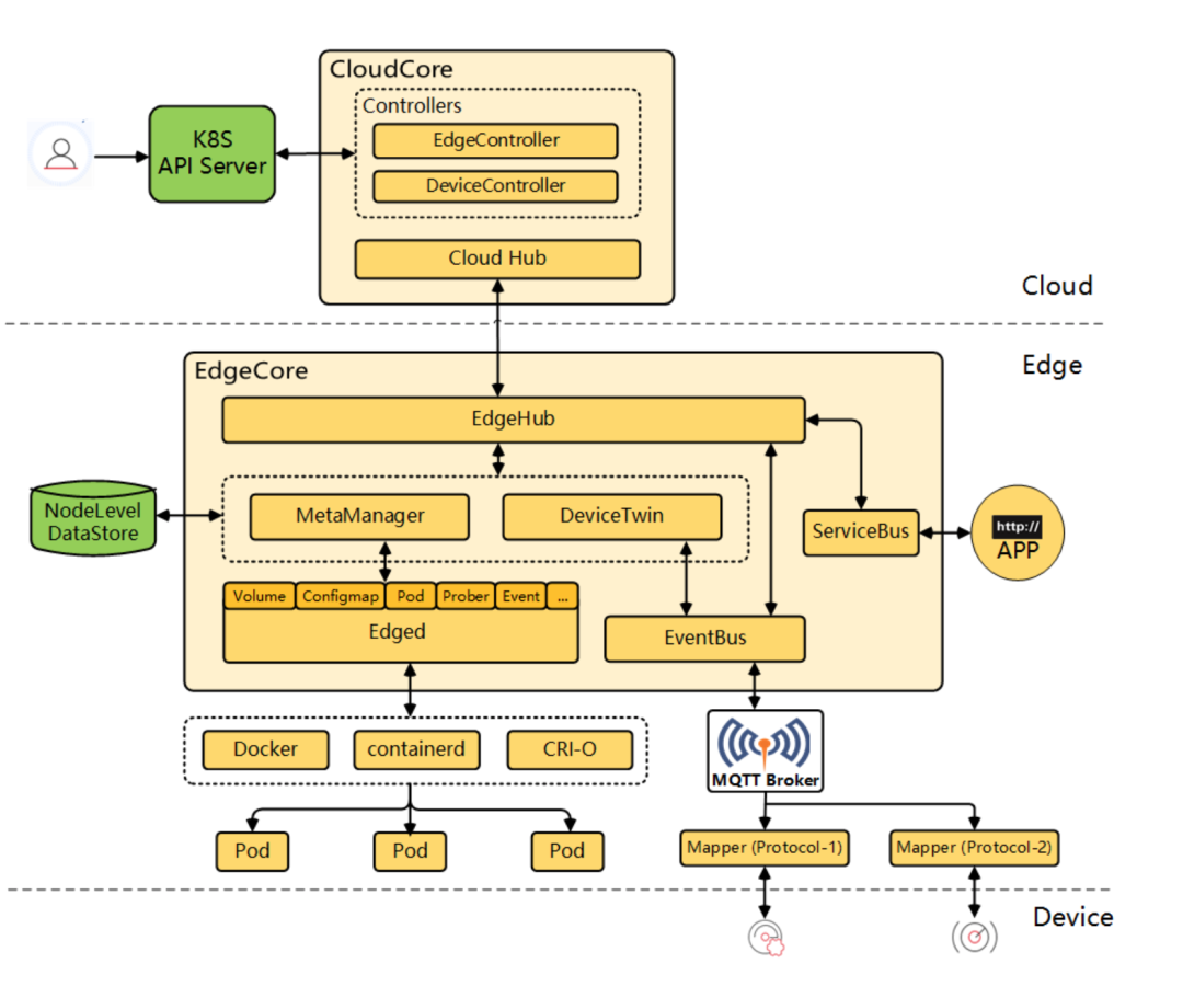 KubeEdge架构上清晰地分为三层,分别是:云端、边缘和设备层。