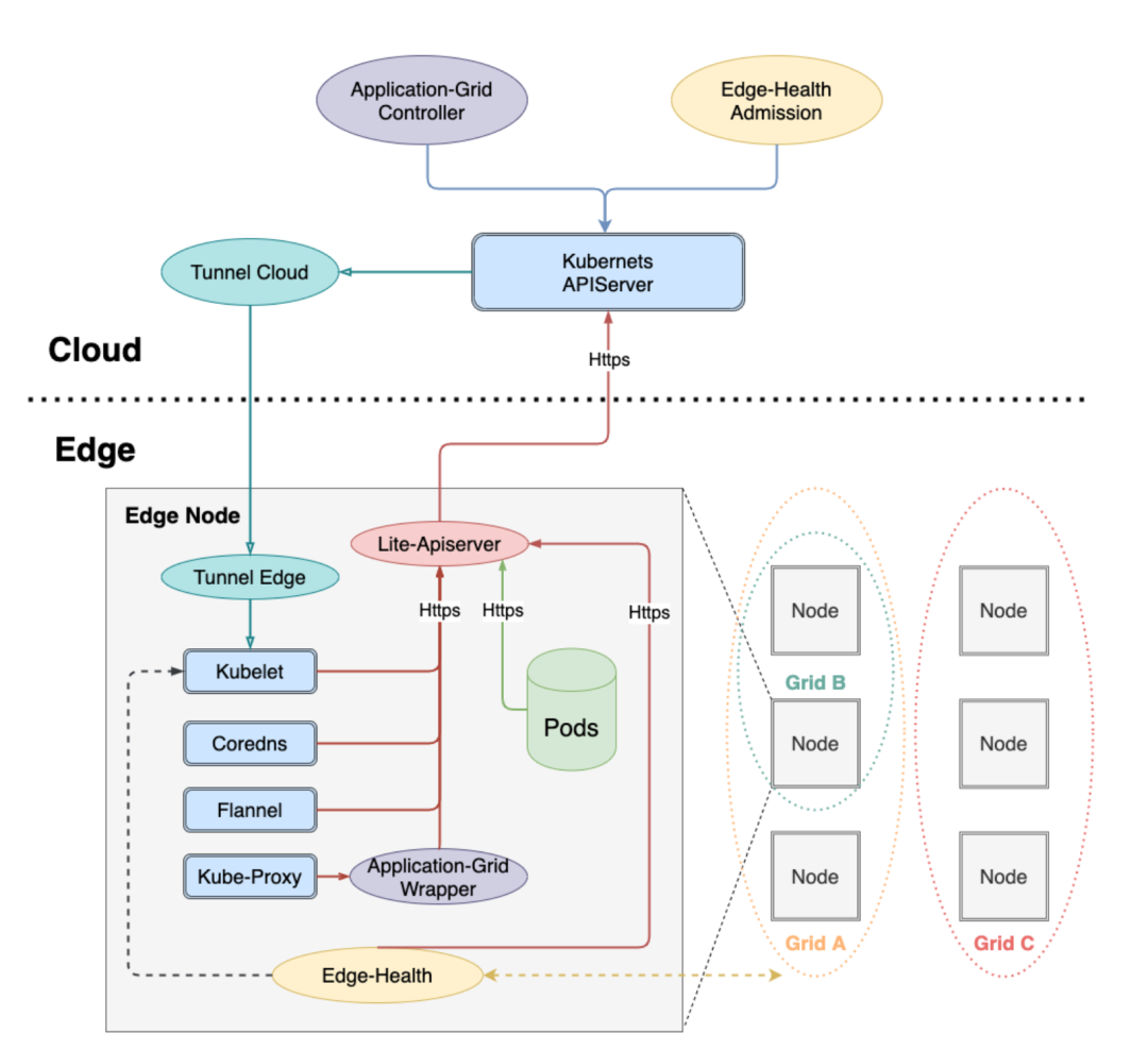 Tunnel Server/Tunnel Agent: 每个边缘节点上的Tunnel Agent将主动与云端Tunnel Server建立双向认证的加密的gRPC连接,同时云端将通过此连接访问到边缘节点及其资源。