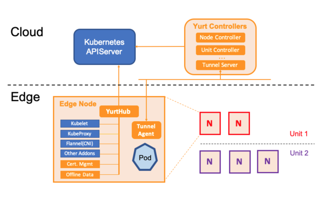 YurtHub: 代理各个边缘组件到K8s Master的通信请求,同时把请求返回的元数据持久化在节点磁盘。当云边网络不稳定时,则利用本地磁盘数据来用于边缘业务的生命周期管控。同时云端的Yurt Controller Manager会管控边缘业务Pod的驱逐策略。