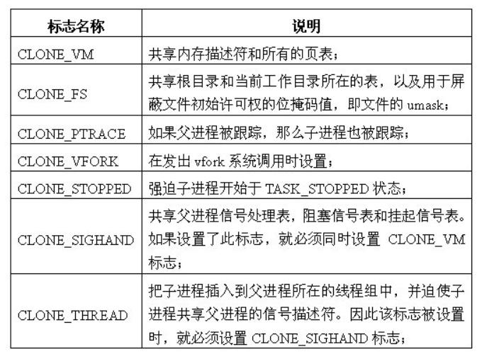 | clone_flags | 与clone()参数flags相同, 用来控制进程复制过的一些属性信息, 描述你需要从父进程继承那些资源。该标志位的4个字节分为两部分。最低的一个字节为子进程结束时发送给父进程的信号代码,通常为SIGCHLD;剩余的三个字节则是各种clone标志的组合(本文所涉及的标志含义详见下表),也就是若干个标志之间的或运算。通过clone标志可以有选择的对父进程的资源进行复制; |