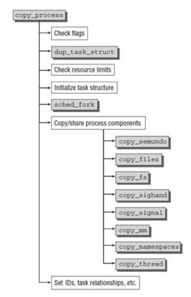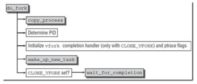 fork, vfork和clone的系统调用的入口地址分别是sys_fork, sys_vfork和sys_clone, 而他们的定义是依赖于体系结构的, 而他们最终都调用了_do_fork(linux-4.2之前的内核中是do_fork),在_do_fork中通过copy_process复制进程的信息,调用wake_up_new_task将子进程加入调度器中