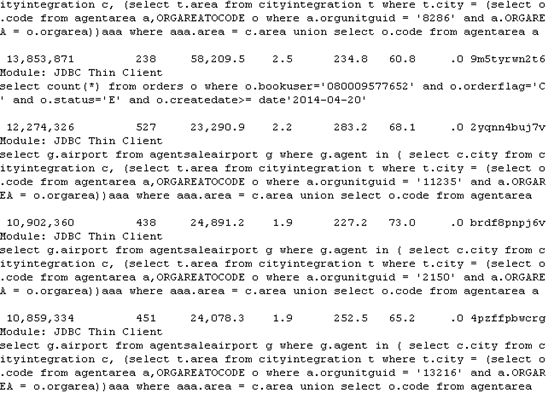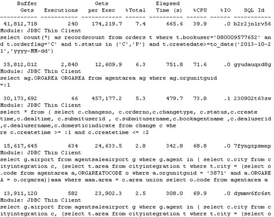 每秒硬解析83次,太高,系统有多处应该使用绑定变量但未使用的地方,过高的硬解析不利于系统的稳定性、扩展性,存在较大隐患。后续我们将把这些应该使用绑定变量但未使用的SQL语句查找出来,以便开发进行相应修改。