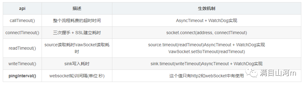 一共可以设置5个超时时间分别如下:关于OkHttp的超时时间