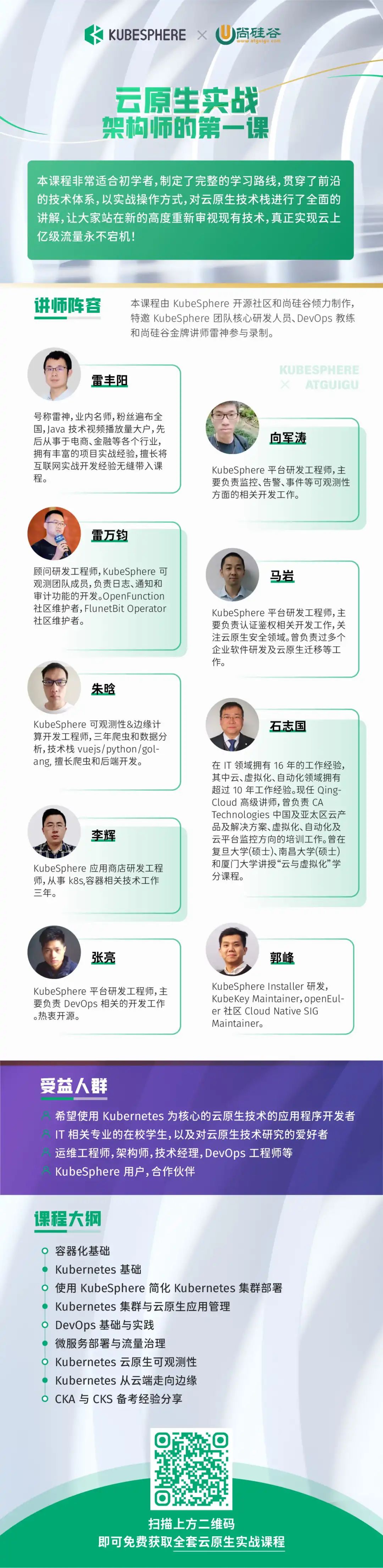 如果你更倾向国内的课程,可以关注 KubeSphere 开源社区联合尚硅谷发布的《云原生实战》系列课程,该课程不仅仅包含了 DevOps,而是对云原生技术栈进行了全面的讲解,课程和资料全部可以免费获取和学习。